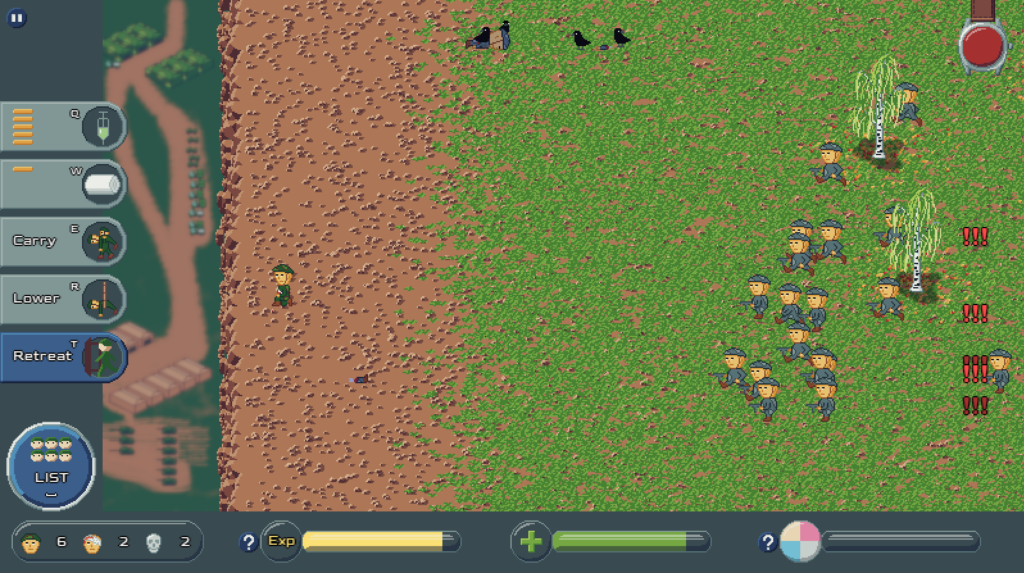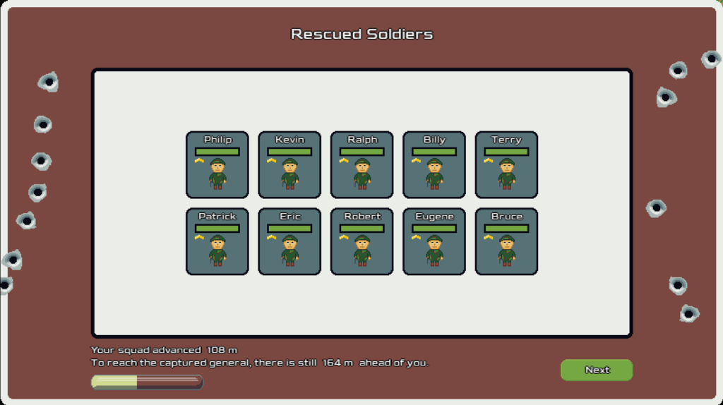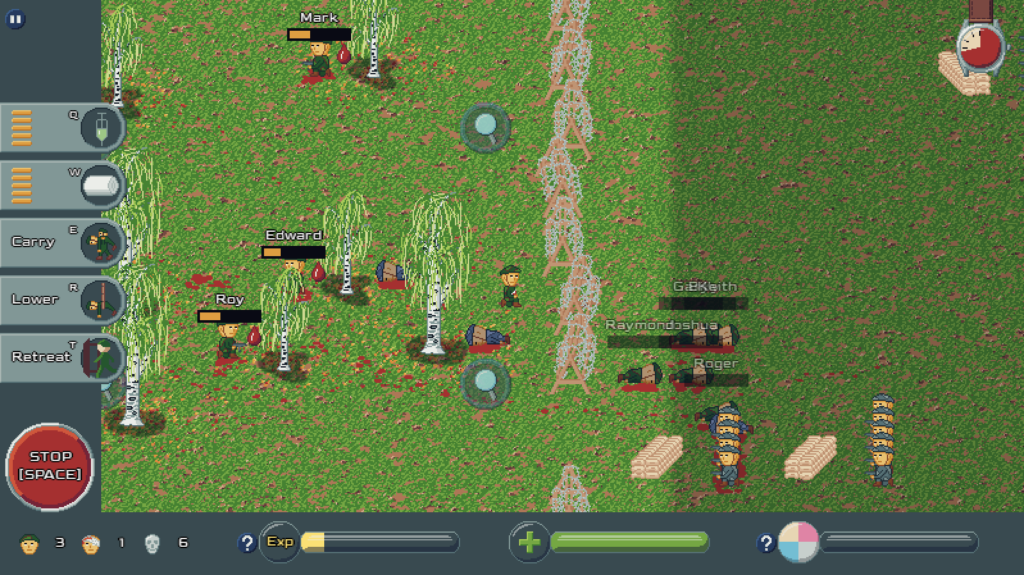 Základ hrateľnosti: liečite spoluhráčov pomocou morfínu a obväzov, počas boja zbierate skúsenosti a okamžite investujete do vylepšení (šanca na kritický zásah, trvalo vyšší damage, vyššia efektivita liečby). Počas postupu prehľadávate body na mape – môžete nájsť dočasnú nezraniteľnosť alebo iné bonusy, ktoré tím „prepnú“ do overpower stavu. Spolubojovníci sami útočia a pri nízkom zdraví sa kryjú za stromami či prekážkami; ak im dôjdu sily a zdroje nestačia, musíte ich dotiahnuť do bezpečnej zóny na začiatku mapy a spustiť dolu útesom. Ak zlyháte s tempom, spustí sa časovač a nepriateľská vlna vyčistí zákopy. Misiu ukončíte dvoma spôsobmi: zachránite generála, alebo ustúpite a skúsite to znova s „vylepšeným“ tímom. Hra, okrem „hlavnej pribehovej misie“ pracuje aj s dennými levelmi – každý deň príde nové rozloženie, iné podmienky a škála obtiažností od „easy“ po „takmer nemožné“.